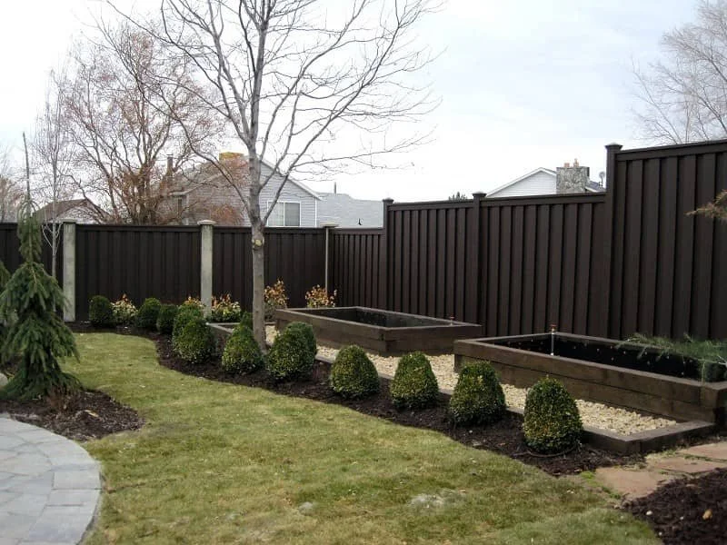 This style of Trex Fence is similar to the previous one but it’s a darker color, which helps you get an idea for the color you are looking for. It also has different heights to accommodate the ground layout and is paired with landscaping and some planting boxes. You can also see a different style of the post being used to the left side of this picture.
